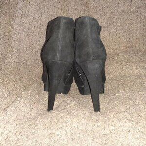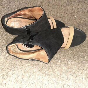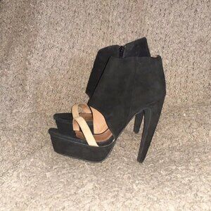 JEFFREY CAMPBELL-Black Suede/Tan Strap-Curved Stiletto-Open Toe Bootie-Zip-Sz 37