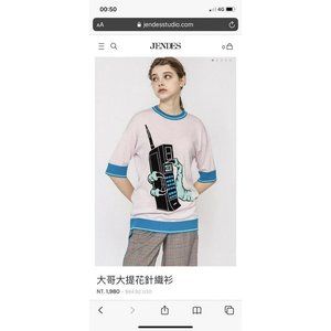 JENDES Mobile Phone Light Pale Pink Soft Knit T-shirt with Blue Rims Size S