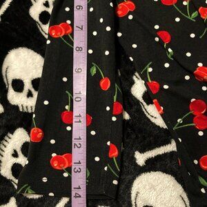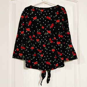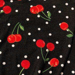 Highlights include a classic scoop neckline, adjustable tie hem, oodles of stretch, zero fasteners (it is a pull-on garment), and the seriously darling blend of red cherries paired with white polka dots on a crisp black background. 🍒🤍🖤😍