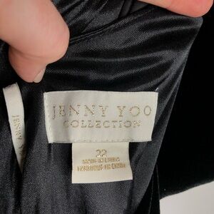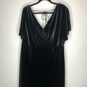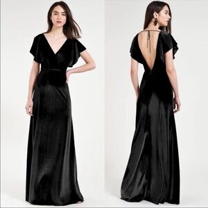 Jenny Yoo Ellis bridesmaid’s dress in a luxurious black stretch velvet material. Such a beautiful gown for any party or event! Great for Fall and Winter weddings! Invisible zipper up the back. Flutter sleeves & v-neckline. An open back topped with a slender tie makes a dramatic finishing touch. Hanger ribbon inside still intact. In excellent used condition with no flaws. *Note length was altered; top of shoulder to hem is approx 57.5”. See pics for measurements. Plus size women’s size 22.