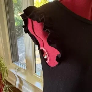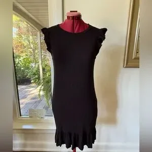 This chic black mini dress with ruffle sleeves and a ruffle hem is made of soft stretch/knit jersey. So comfortable! This flattering and stylish dress can be worn casually in the summer with sandals or in cooler weather with a leather jacket and tights