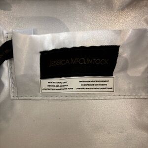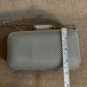 JESSICA MCCLINTOCK Elegant Silver Beaded Crossbody Clutch Bag with Chain Strap. This elegant silver clutch bag is perfect for any occasion. Its sleek design and shimmering finish add a touch of sophistication to your outfit.