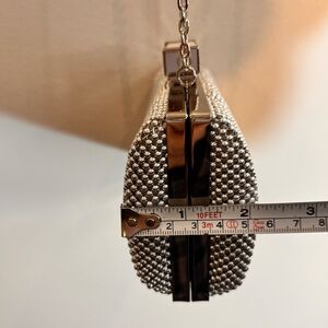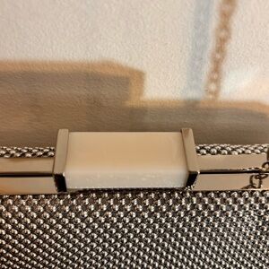This elegant silver clutch Crossbody bag is perfect for any occasion. Its sleek design and shimmering finish add a touch of sophistication to your outfit. Mother of pearl style rectangular closure. Measurement ms in pictures.
