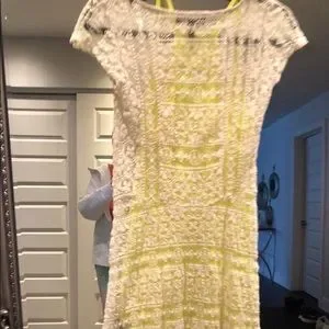 Jessica simpson 2 piece dress underling flashy yellow and top off white lace asymmetric size x small