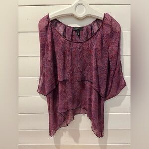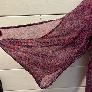 Lightweight sheer printed blouse with an asymmetric draped overlay, wide flutter sleeves, and a split-back design. The vibrant abstract print in purple, red, and navy adds a boho-chic touch. Loose and flowy
