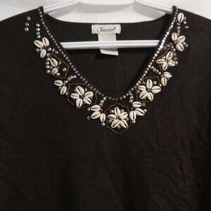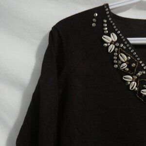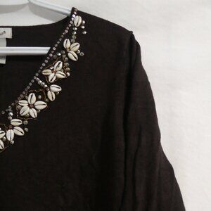 JESSICA | large | Brown V-Neck Sweater with Sequin & Sea Shell Floral Design