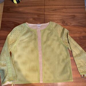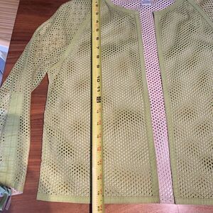 J' Envie unstructured real leather jacket, overblouse, layering piece in an unusual shade of muted celery green. Unlined, minimalist design for clean, modern silhouette, textured with small holes. Corded at wrist for ruched sleeve option. Women's medium in excellent used condition with no wear, damage or stains detected. Light weight for year round use. Wear with favourite jeans, skirts, over a simple dress for instant impact. Unusual and flattering colour that's easy to pair with most colours. Choose some complimenting pieces from Our Closet (some suggestions shown, all listed and priced separately) to build a brand new look, make a bundle, save a bundle. Fun and Fashion at Lemon Squeezy Shop🍋