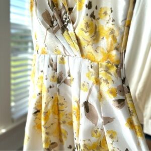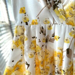 * polyester fabric has a sheen and a bit of texture in the weave, looks like Thai silk. Beautiful yellow & tan floral print