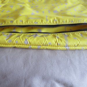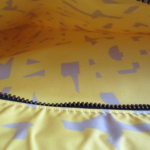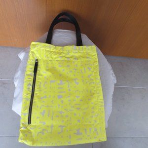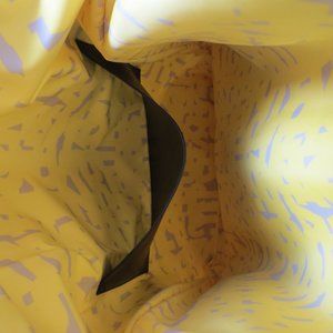 Bright yellow pattern featuring top handles and an open top design. Inside pocket.