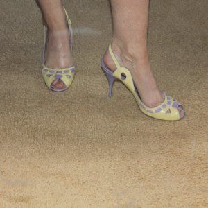 Made in Italy, Size 8B. Beautiful butter yellow with lavender accents. Worn once, too high for me, I prefer low heels. Lovely summer sandal.