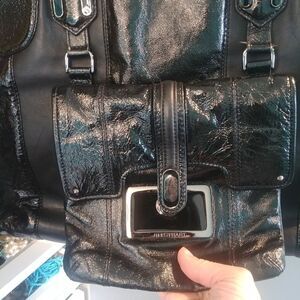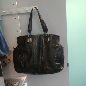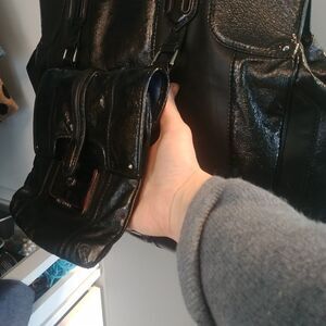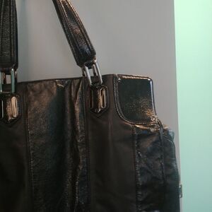 Very large shoulder bag to carry all you need in style. Leather and patent leather combo, beautiful lining. 3 departments inside, central one with zipper.
