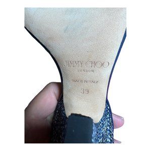Jimmy Choo metallic tweed city sandal with leather piping. 3. 3" slim block heel. Wide strap bands open toe. Adjustable ankle strap.
