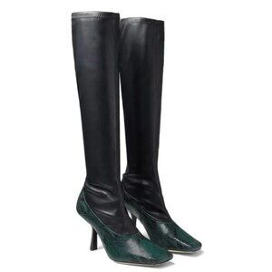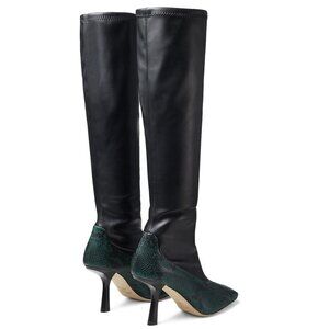 Our MYKA knee boots in dark moss snake printed leather and black stretch bonded fabric ooze understated glamour. The sharp, square toe - a new silhouette that dominates - is balanced on a sculptural 85mm heel to elongate the leg. A versatile boot to carry you from dawn to dusk.
