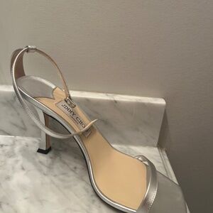 Silver heeled sandal (90mm heel) lightly worn once or twice! Have original price listed at bottom and original receipt available to prove authentic if requested!!!