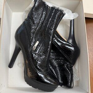 LOVE, LOVE, LOVE these Jimmy Choo Trixie boots. Purchased them while living in Miami so rarely wore them. Material is patent leather with probable faux fur lining. Size is 38. Great condition, just see a bit of the manufacturer black glue around the side of soles. Zipper and stud detail are a pewtered silver finish. Box included.