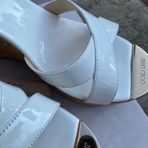 STUNNING patent leather platform cross ankle strap sandals. Patent leather white. Look gorgeous on and so comfortable! These look great with everything! Perfect with jeans, sundress, dress shorts, pants. Easy to wear and elevates any outfit! Still in original box with original tissue paper!! Only worn a few times as you can see by the soles. EXCELLENT condition! These are sizes 39.