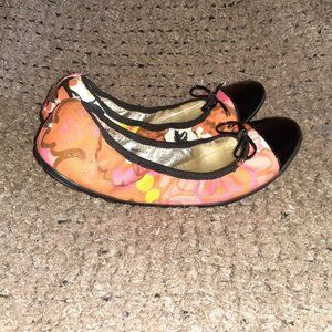 These Jimmy Choo round-toe ballet flats were crafted in Italy of beautiful floral print canvas, elasticized top lines, and liquid-shine black patent calfskin leather cap toe details.