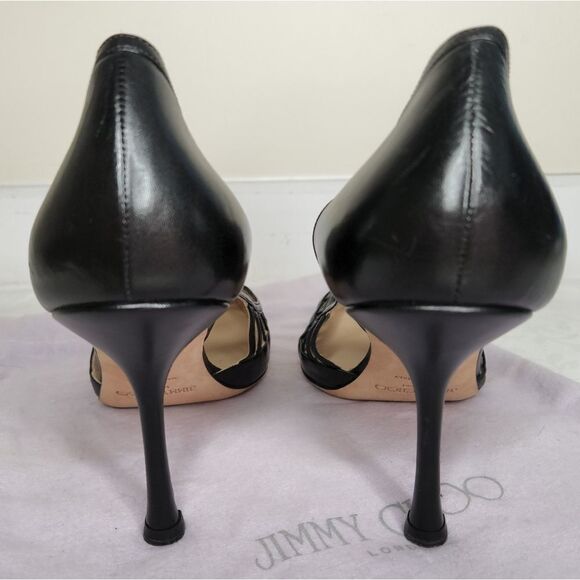 Elegant Art Deco peakaboo cutout black leather high heel stilleto pumps, by Jimmy Choo.