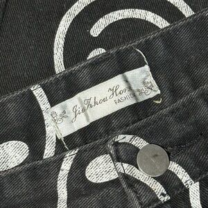 JIUZHOU HORSE black jeans with white smiley faces, size 36. Fun, playful print perfect for casual outfits. Laid flat measurements below.
