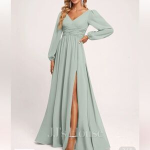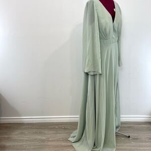 JJs House A-line V-Neck Chiffon Bridesmaid Dress Bell Sleeves Slit Sage 14/16