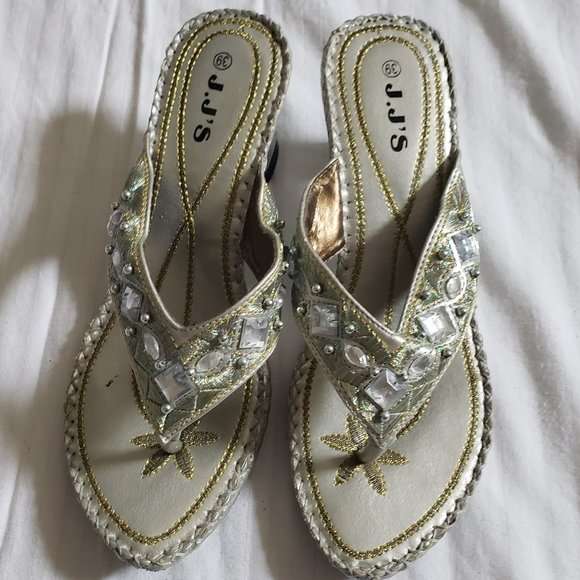 J.J.'s Dressy Women's small heel slip on silver sandal, embellished with large clear stones and silver beads as well as gold and greenish embroidery. Size 39, which is an 8.5 US. In good condition - there is some wear on the braiding around the outside of both shoes. These were worn only a few times to weddings - very comfortable.