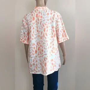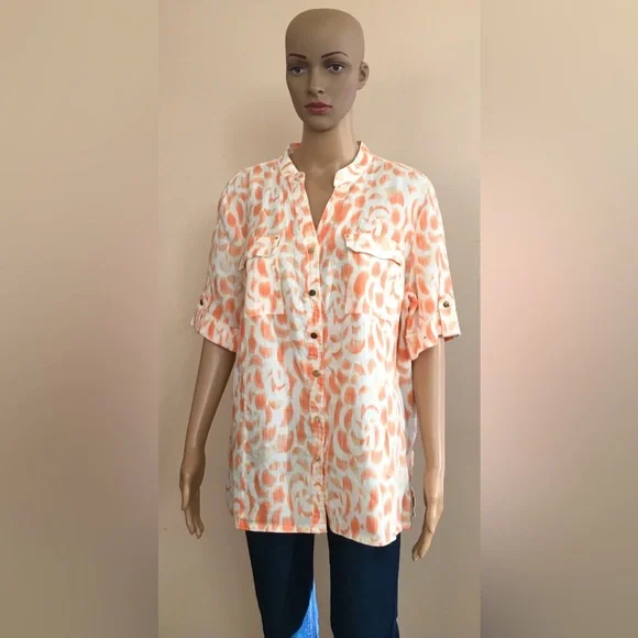 Peach and White print short sleeve button down top. Breast Pockets. Slit on both sides. Faux roll up cuff. Gold buttons