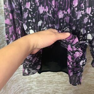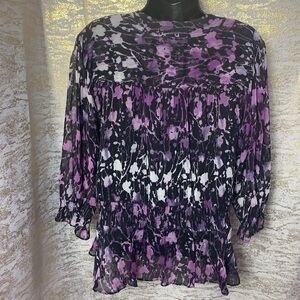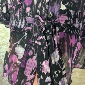 - Gorgeous black/purple/white tones floral long sleeve button down semi sheer blouse.