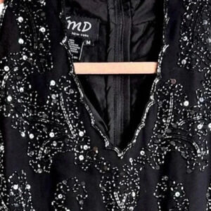 Do you have a special event coming up? This is the top to wear! Black sequinned blouse, with gorgeous hem detailing, fully lined, long zipper in the back for easy access, vneck. Size Medium. Excellent preowned condition