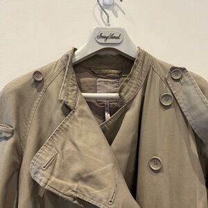 JNBY cotton trench. Size Small. Softest cotton ever in perfect khaki colour. Lots of detail - flaps, buttons, epaulettes, belt. 100% cotton except for sleeve lining (100% polyester). Washable, lay flat to dry. Excellent year round (west coast) or multi-season elsewhere. Very versatile.
