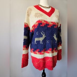 J.NNA Fuzzy Cozy Reindeer Pattern Sweater - Red, Blue, Cream. Relaxed Fit Small