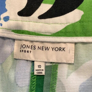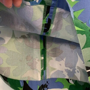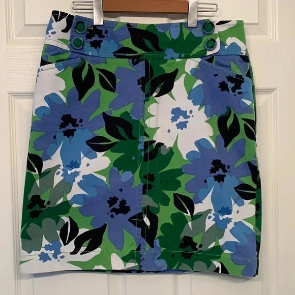 Gorgeous floral skirt with pockets and detail along waist. Slip on. Fabric feels like denim. Green stitching. Colors are purple, blue, green, white, black. Size 10.
