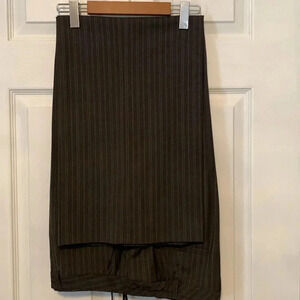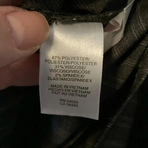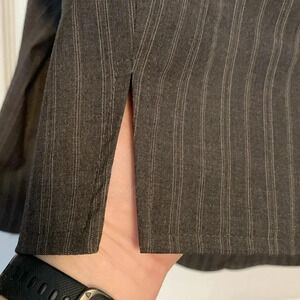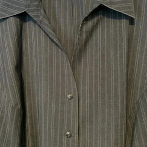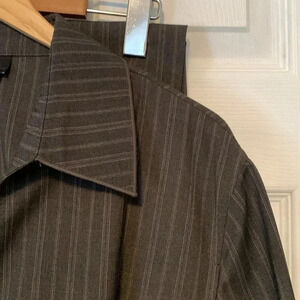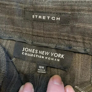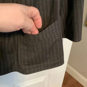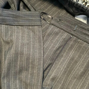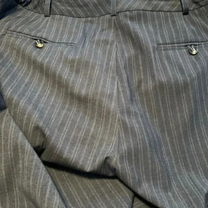 Gorgeous. Dark grey/taupe pant suit with faint pinstripe. Fabric has Stretch. Crisp. Great quality. Jacket has buttons and front flat pockets. Size 20W. The matching straight leg pants have flat front and side pockets. Size 16W. Multi season wear. Neutral. Immaculate.
