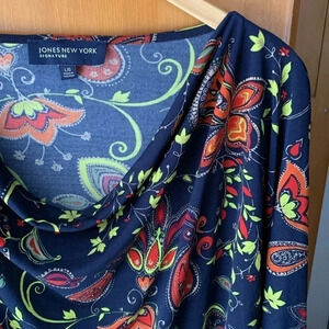 Pretty navy tunic with stretch, 3/4 sleeves. Coordinating colors or orange/red, white and lime / chartreuse green. Size Large.