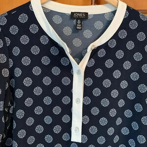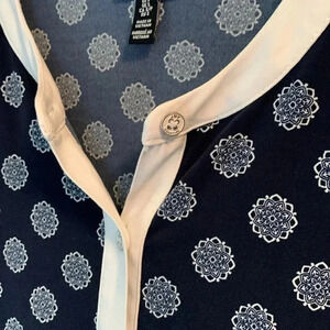 Navy with medium blue and white medallion pattern. White collar and buttons. Elastic at cuffs. Size S with stretch. So pretty!