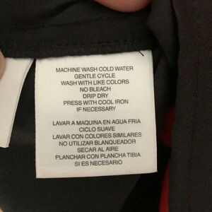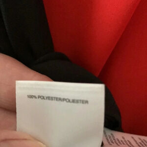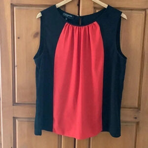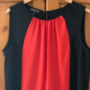 Black sleeveless tank blouse with red front panel. Small gold button on back of neck. Light and flowy. Size 12.