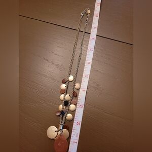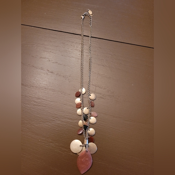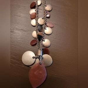Gold color multi strand necklace with amber-colored plates and gold-toned discs. Excellent condition.