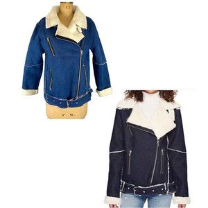 Size medium. Denim with off white Sherpa lining. Foldover collar, buckle detailing under the collar. Side zip. Faux upper zip pocket, lower real zip pockets. Silver hardware. Removable belt on the bottom, you could technically wear it denim up or Sherpa. Sherpa edge detailing at seams. Full length sleeves can be cuffed. Sherpa lined.