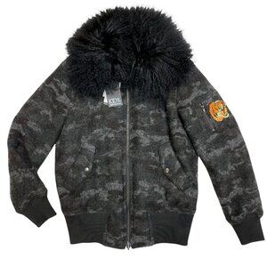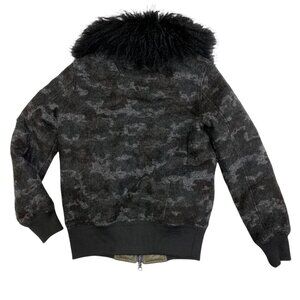 JOCELYN Coat Lamb Fur Trim Wool Bomber Jacket XS NWT Charcoal Camo Reversible.
