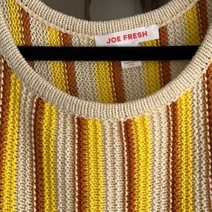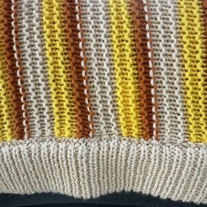 Vibrant knit tank with multicolor stripes and matching midi tube skirt. Features yellow, brown, and cream tones. Never worn.