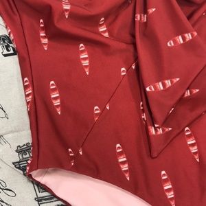 Wooden canoes drift across a knotted one-piece swimsuit designed with cutouts and a plunging neckline to show some skin while you're on the waterfront.