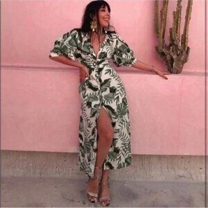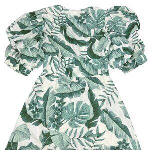 JOHANNA ORTIZ X H&M Linen Midi Dress Tropical Green Leaf Print Size XS