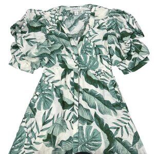Made from a breathable linen blend, it features dramatic puff sleeves, a flattering waist, button closure, and an allover leaty print. The midi length and button-down front offer a chic, effortless silhouette perfect for summer, resort getaways, beach parties, or casual brunches. This limited-edition designer collaboration is both collectible and wearable-don't miss your chance to own a piece of high-fashion resort style. Perfect for any occasion, this dress offers a blend of style and comfort.