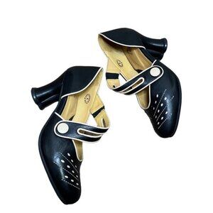 The Allure is a seductive Mary Jane with perforations and embroidery on the toe and an elasticized diagonal strap secured with a leather wrapped button. Made in Portugal, they feature a rubber injected tunite sole and a 3" heart shaped heel.