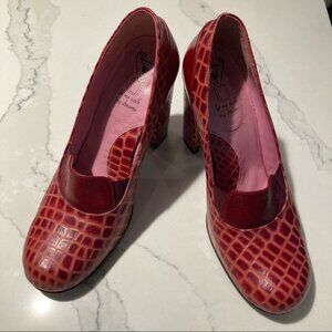JOHN FLUEVOG Sz 9 Croc Alligator Skin Design U Shaped Hollow 3.5” Heel Shoes. Gorgeous. Unique round toe. Classic yet fun. Dress up or down. Leather upper.