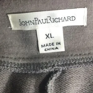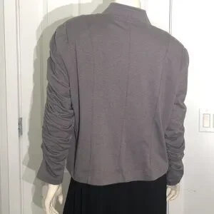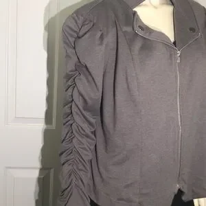 John Paul Richard soft grey jersey material zip up jacket. Shoulder pads and shirring down arms gives this piece a dramatic flare. In excellent pre-loved condition. Size XL.
