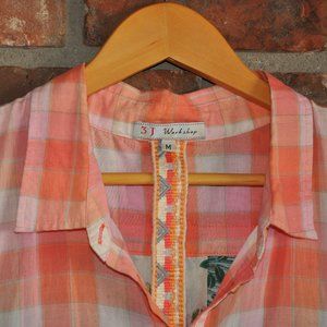 JOHNNY WAS 3J Workshop Sleeveless Blouse Silk Cotton Floral Sheer Plaid Tunic M