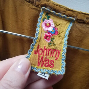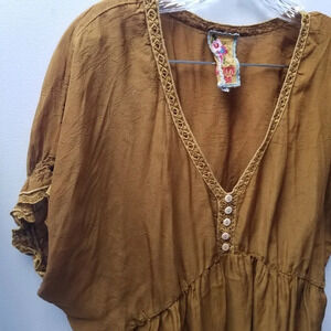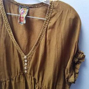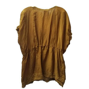 JOHNNY Was Mustard Yellow Crochet Button Cupra Rayon Short Sleeve Blouse XL