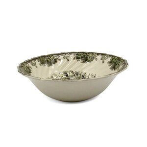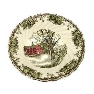 This charming bowl by Johnson Bros, made in England, features a captivating scene of a tree and barn, framed by a scalloped edge.