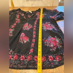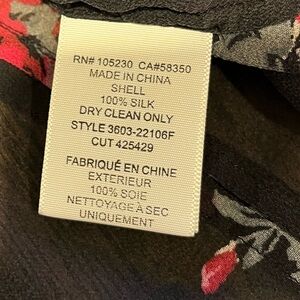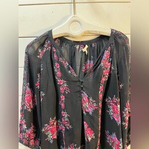 Elegant JOIE blouse in 100% silk with a sheer finish. Features a black background adorned with vibrant floral prints in shades of red and purple, button front detail, and 3/4 sleeves with elastic cuffs. Lightweight and feminine, perfect for both casual and dressy occasions.