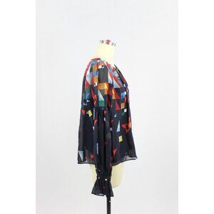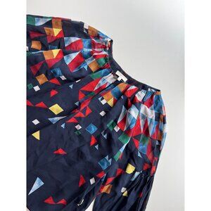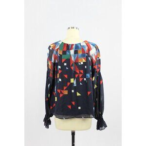 JOIE Burella Navy Geometric Print 100% Silk Georgette Ruffle Blouse, Size S